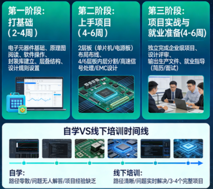又一个很现实的问题。“学多久”大概是每个想入行PCB设计的人,心里都会反复掂量的。毕竟大家的时间都挺宝贵,投入几个月到底能不能换来一份靠谱的工作,这笔账得算清楚。今天我们就来拆解一下,从零基础入门到具备就业能力,到底需要多长时间,以及这条时