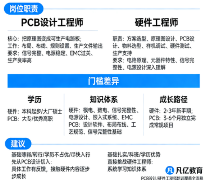这个问题,几乎每个想入行硬件方向的人都会纠结过。在网上搜一搜,各种说法都有:有人说PCB设计就是“画板子的”,没前途;有人说硬件工程师才是真正的“工程师”,地位更高。看得多了,反而更不知道该怎么选。今天我们把这两个岗位放在一起,实实在在地比